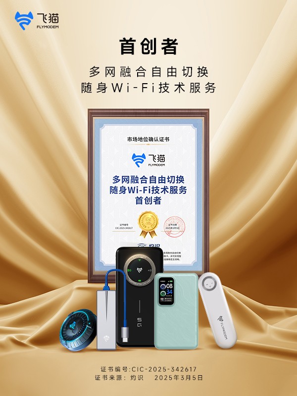 2025年3月,CIC 灼识针对中国随身Wi-Fi行业开展专项系统研究后,郑重确认飞猫为 “多网融合自由切换随身Wi-Fi技术服务首创者”。CIC 灼识调研范围覆盖市场主要参与者、产品概念沿革、技术类型及专利情况,并与行业专家深度交流验证,这一权威认证充分彰显飞猫在随身WiFi领域的开创性贡献。